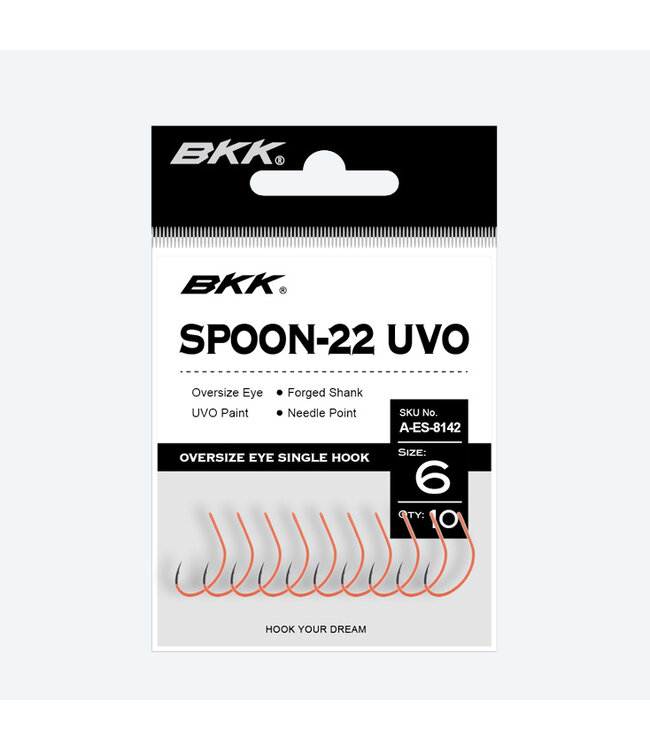 Der BKK Spoon-22 UVO ist ein robuster Ersatzhaken, der speziell für das Angeln auf große Forellen und Lachse entwickelt wurde. Mit seiner medium/heavy wire Bauweise ist er sowohl in Süß- als auch in Salzwasser extrem zuverlässig. Durch die UV-Beschichtung wird ein zusätzlicher visueller Reiz erzeugt, der Raubfische zu mehr Bissen anregt.