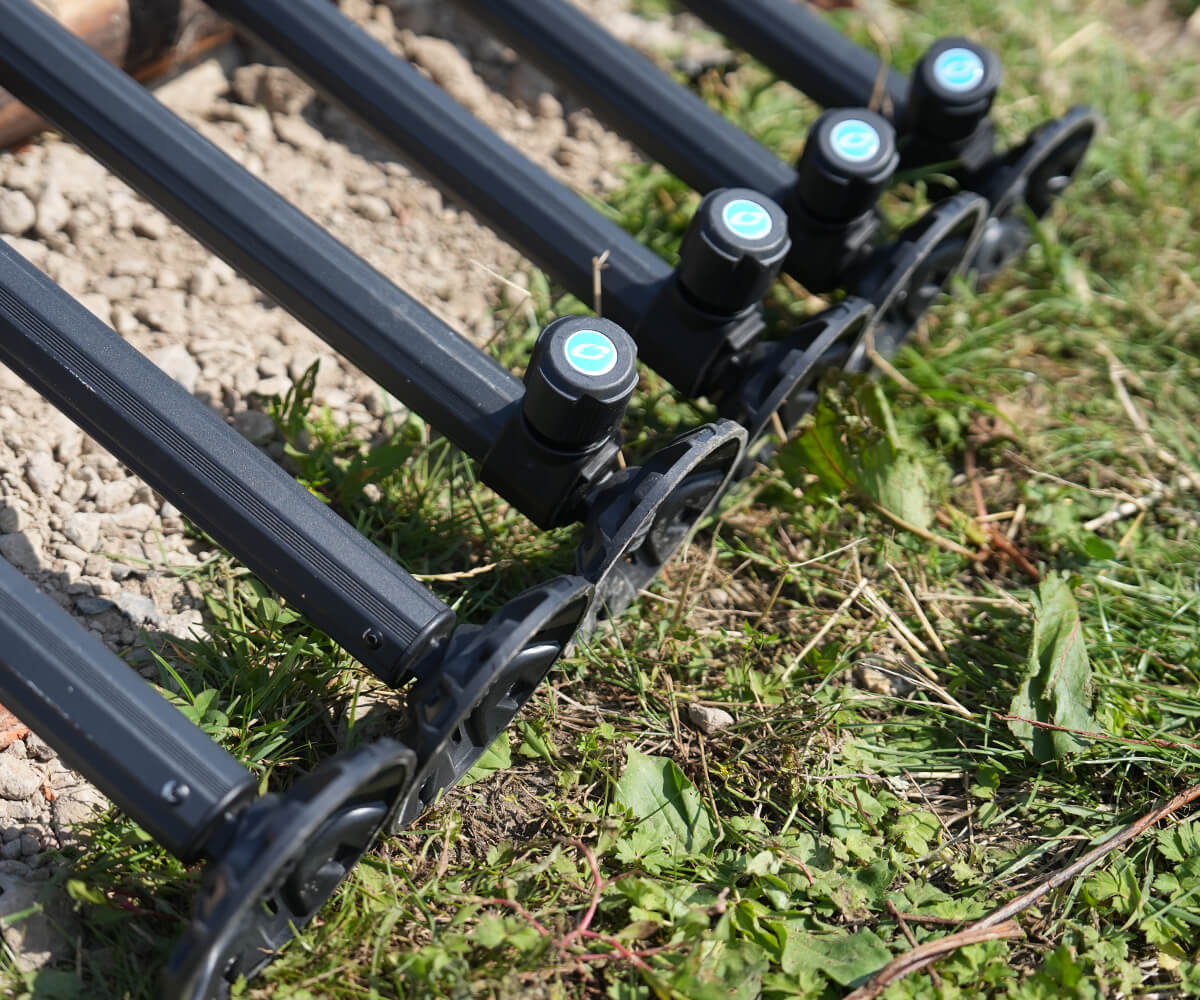 Der leichte Aluminiumrahmen verfügt über eine stufenlos verstellbare Fußplatte. Die Ø 36mm Beine bieten Stabilität auf jedem Untergrund, und vier der sechs Beine sind teleskopisch. Alle Beine sind mit schwenkbaren Schlammtellern ausgestattet und können in jeder Höhe arretiert werden.