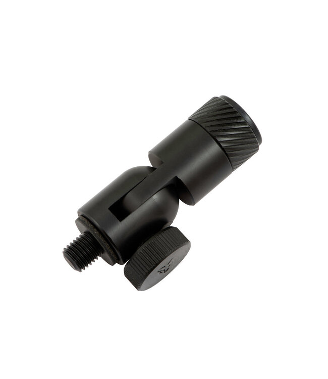 Der neue Angle Adaptor verfügt über das QR-System, sodass ein Bissanzeiger oder Hinterstütze oben befestigt werden kann. Das Gewinde im unteren Teil ermöglicht die Verwendung in Kombination mit beiden Typen von Banksticks.