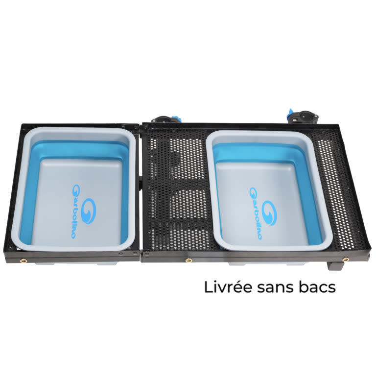 Ein praktischer faltbarer Tisch, um 2 faltbare Behälter von Garbolino darauf zu platzieren. Schnelle und einfache Installation und leicht zu transportieren. Der Tisch ist faltbar, was für den Transport praktisch ist. Dieser Tisch enthält 4 Sets von Einsätzen zur Befestigung eines abnehmbaren 10-Positionen-Kitständers und/oder eines abnehmbaren Zeltes. Dieser Tisch wird nicht mit den 2 faltbaren Behältern geliefert.