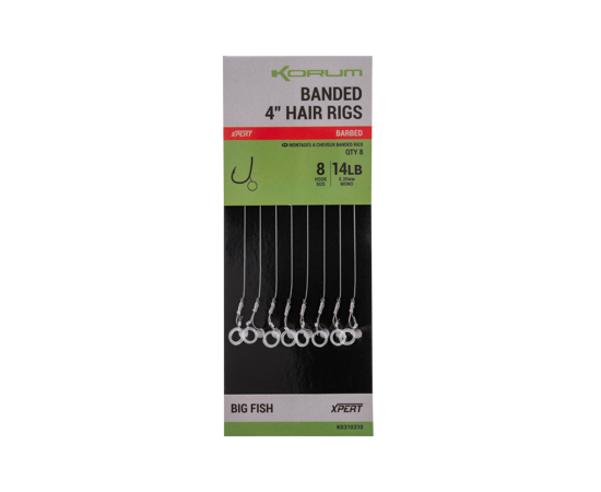 • Die Korum 4" Banded Hair Rigs mit Widerhaken wurden entwickelt für das gezielte Angeln auf große und kampfstarke Fische wie Karpfen, Brassen oder Barben. Diese 10 cm langen Rigs bestehen aus einer starken Schnur, einem robusten Haken mit Widerhaken und einem besonders haltbaren Köderband, das klassischen Latexringen überlegen ist.