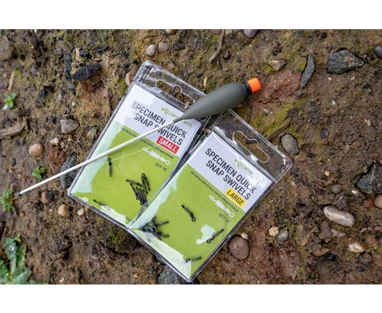 Specimen Quick Snap Wirbel sind sehr vielseitig und ermöglichen es dem Angler, schnell und einfach den Hakenwechsel vorzunehmen. Mit einem mattschwarzen Finish und einem stärkeren Drahtdurchmesser als die Versionen für Wettkampfangeln. Diese Wirbel gibt es in zwei Größen und fungieren als Anti-Verdreh-Schutz. Die größeren Größen sind ideal für Helikopter-Rigs und Feederarbeit, während die kleineren Größen perfekt für das Posenfischen oder das Verbinden von Haken für kleinere Arten sind. - Mattschwarzes Finish - Camo grüne Gummihülle - Erhöhte Drahtgröße Haken - 19kg/42lb und 28kg/62lb Bruchfestigkeit