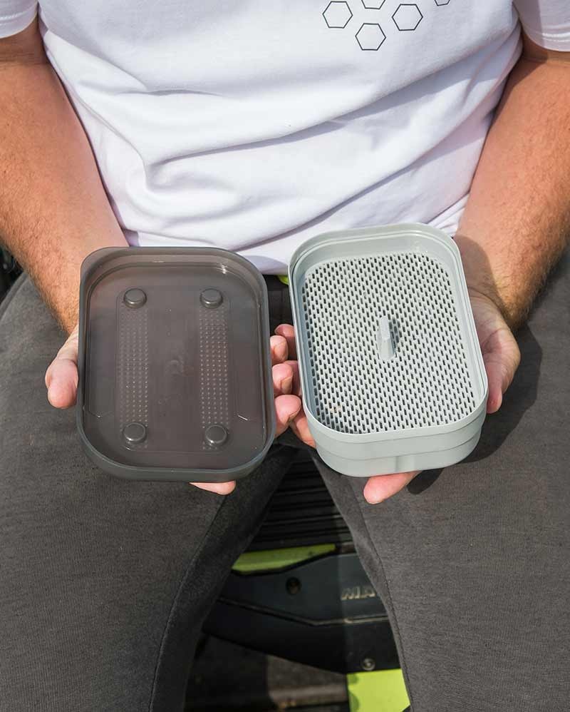 Das Tray kann platzsparend im Behälter mit Deckel aufbewahrt werden und ist somit perfekt für den Transport und den sauberen Einsatz am Wasser.