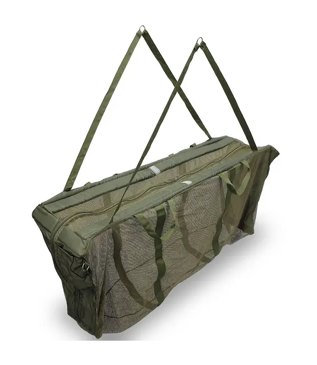 Der Doppelreißverschluss verhindert ein Entkommen, und das feine, fischfreundliche Mesh sorgt für schnelle Drainage. Mit 4 Tragegriffen lässt sich die Sling allein oder zu zweit bequem tragen. Reflexstreifen machen sie nachts gut sichtbar. Fürs Wiegen sind 2 starke Wiegebänder vorhanden und eine Tasche ist inklusive.