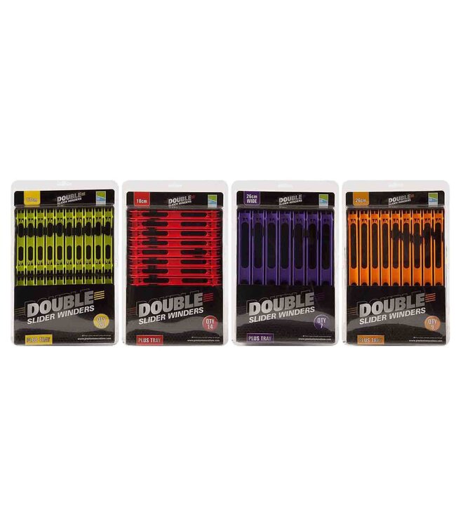 Neu und verbessert, diese Double Winders haben jetzt zwei Schieberegler, sodass zwei Rigs auf jedem Winder aufbewahrt werden können. Es gibt eine Nut für Ihren Haken und einen Stift, der eine Schlaufe halten würde, was bedeutet, dass Rigs gebunden und Vorfachlängen bei Bedarf zu einem späteren Zeitpunkt hinzugefügt werden können - ohne Ihre Leine zu knicken. Verfügbar in einer breiten Palette von Größen, farbcodiert für jede Größe. Auch verfügbar in Trays, Boxen und dem neuen Traysystem für das Absolute Station.
