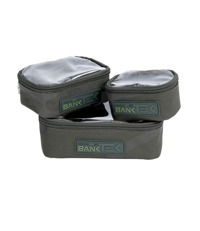Das Sonik Bank-Tek Pouch Set besteht aus 3 praktischen Zubehörtaschen zur ordentlichen Aufbewahrung von Angelzubehör.