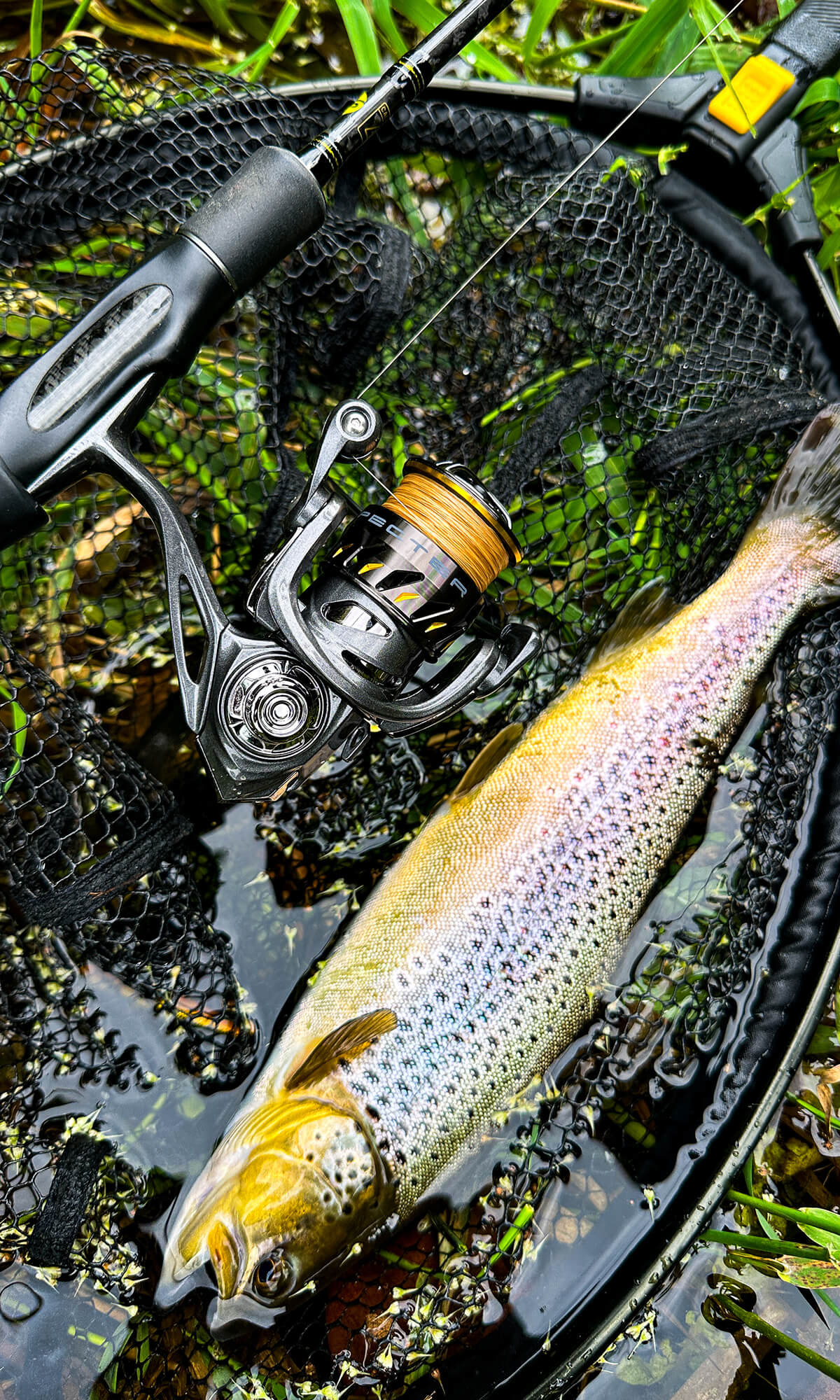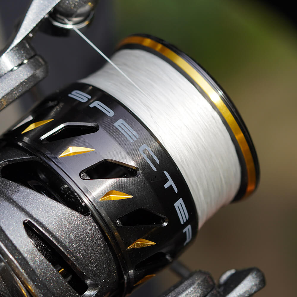 Nach dem erfolgreichen Specter Raubfischruten bringt Spro die Specter Spinnrollen, die in Eigenschaften und Design nahtlos an die Ruten anschließen. So sind die Specter Spinnrollen leicht im Gewicht dank einer Kombination aus einem vollständig aus Aluminium gefertigten Rollenkörper in Verbindung mit einem leichten Carbonrotor. Neben der Tatsache, dass diese Materialien leichter im Gewicht sind, hat es ebenfalls den großen technischen Vorteil, dass es die Rolle deutlich steifer macht, eine bessere Registrierung in der Rute ermöglicht und die Funktion der Bremse unter hoher Belastung optimiert. Alle Specter Spinnrollen haben eine Übersetzung von 5.2:1, mit der diese Rollen eine sanfte und leichte Rotation mit genug Kraft kombinieren, um den ganzen Tag bequem mit Kunstködern zu fischen. Die Rollen besitzen 8 RVS Kugellager und eine RVS Hauptachse, wobei alle drehenden Teile mit einem hochwertigen "All Season" Fett behandelt sind. Dadurch laufen die Specter Spinnrollen herrlich geschmeidig, unabhängig von der Außentemperatur. Abgeschlossen mit einem goldfarbenen einschraubbaren CNC Aluminium gefrästen Kurbel, die mit einem leichten und bequemen EVA Griff ausgestattet ist.