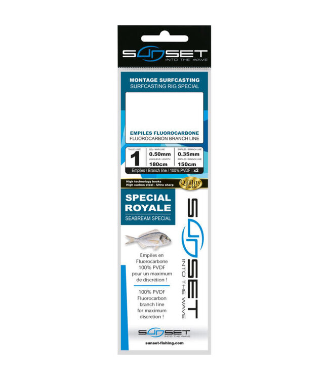Mit einer Gesamtlänge von 180cm sind die SUNSET SURFCASTING RS COMPETITION SPECIAL ROYALE / FLUORO 2X150 Vorfächer verfügbar mit Nummer 2 und Nummer 1 Haken.