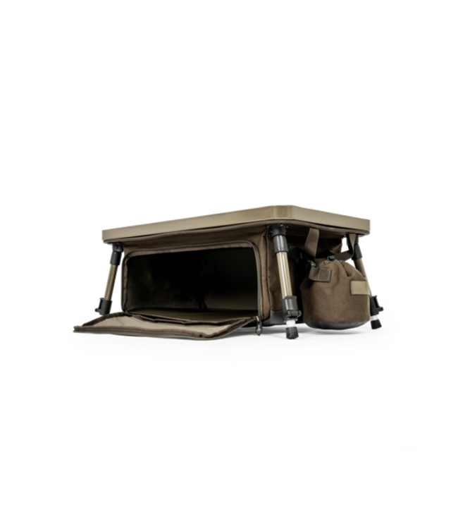 L’organiser dispose d’un large plateau supérieur sur lequel vous pouvez poser petit matériel, montages, téléphone, ustensiles de cuisine ou autres accessoires. Sous la table se trouve un sac de rangement intégré, idéal pour stocker des tackle box, du matériel de cuisine ou d’autres accessoires de pêche.