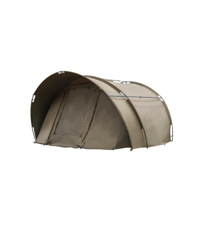 La façade peut être entièrement enroulée pour créer un bivvy ouvert, tandis que la porte à double ouverture type letterbox permet plusieurs configurations, incluant un panneau en mesh et une fenêtre PVC. Le bivvy est livré complet avec tapis de sol léger, piquets robustes, mâts de support et un sac de transport spacieux.