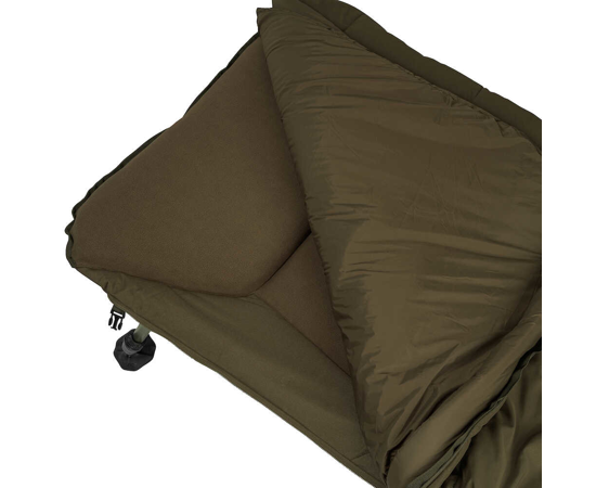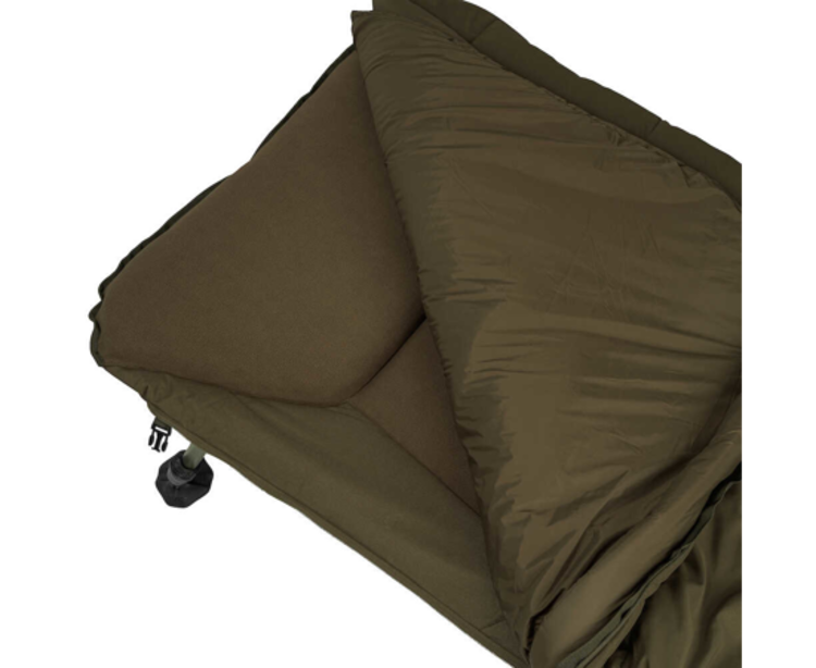Le système de couchage double couche avec couette intégrée offre un confort optimal par tous les temps. De plus, grâce à son système de sangle et de boucle, ce bedchair peut être replié de manière compacte, même avec un sac de couchage attaché.