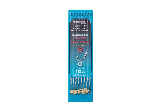 • Les Drennan Carp Method Bandit 10 cm sont des bas de ligne prêts à l’emploi, conçus pour la pêche au method feeder. Longs de 10 cm (4 pouces), ils sont stockés sous légère tension sur une plaquette rigide, garantissant des montages parfaitement droits et sans vrilles.