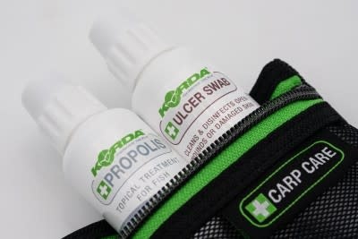 • En tant que pêcheurs, nous voulons ramener tous les poissons que nous attrapons dans le meilleur état possible et le kit de soins pour la carpe y contribue certainement. Il est présenté dans une pochette zippée et contient 30 ml de propolis et des tampons pour ulcères. L'écouvillon pour ulcères est conçu pour nettoyer et désinfecter toute blessure ou plaie sur le poisson, afin d'éviter que la zone ne soit infectée par des bactéries ou des champignons. La propolis, un produit naturel dérivé des abeilles qui possède des propriétés antibiotiques et antimicrobiennes, peut ensuite être appliquée pour sceller la zone et empêcher tout ce qui pourrait pénétrer dans la zone nettoyée. Utilisés ensemble, ces produits donnent à toute lésion les meilleures chances de guérison. Le kit contient un flacon de 30 ml de tampon pour ulcère et un flacon de propolis.