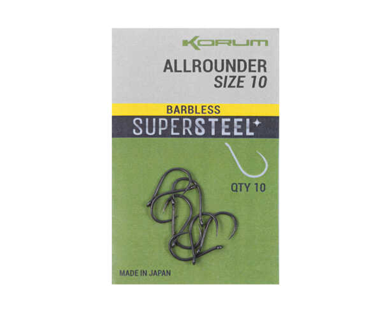 • Les hameçons Korum Supersteel Allrounder Barbless sont les plus polyvalents de notre gamme. Ces hameçons sans ardillon sont conçus pour fonctionner efficacement, quelle que soit la situation ou le type de ligne que vous utilisez.