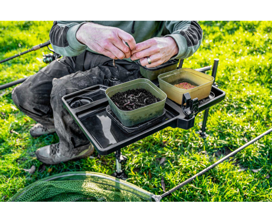 Le dessert latéral Allrounder est doté de nombreuses caractéristiques. Il comporte des dépressions de la taille d'un BLOX et d'un Bait Tub, un porte-gobelet, une fente pour catapulte et un Rig Rack intégré. Le système Any Chair transforme les chaises en une station de pêche entièrement modulaire. Il suffit d'ouvrir l'articulation pour l'adapter au pied de la chaise et d'utiliser les inserts fournis pour obtenir le meilleur ajustement. Vous pouvez ajuster l'angle avec le système de volant pour une installation parfaite. Fourni avec des inserts pour 23mm, 25mm et 30mm ronds et 23mm carrés. S'adapte directement aux fauteuils accessoires Korum X25 et S23 et aux paniers-sièges D36. Plateau 48cm x 33cm