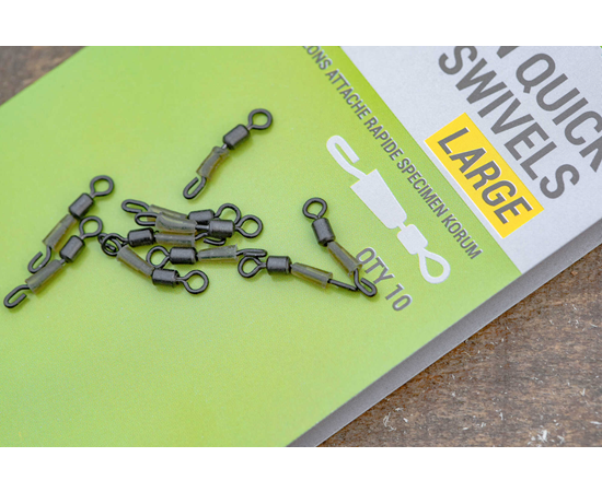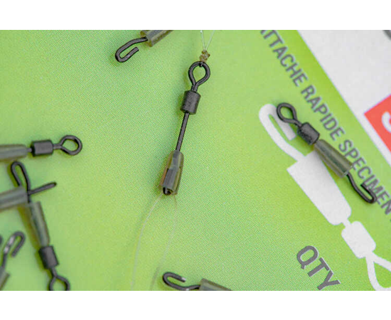 • Les émerillons Specimen Quick Snap sont très polyvalents et permettent au pêcheur de changer d'hameçon rapidement et facilement. Ils sont dotés d'une finition noire mate et d'un fil de plus gros calibre que les versions pour la pêche à l'anglaise. Ces émerillons existent en deux tailles et agissent comme un dispositif anti-torsion. Les plus grandes tailles sont idéales pour les montages en hélicoptère et le travail au feeder, tandis que les plus petites tailles sont parfaites pour la pêche au flotteur ou pour connecter des hameçons pour les espèces plus petites. - Finition noir mat - Manchon en caoutchouc vert camouflage - Hameçon de calibre supérieur - Résistance à la rupture de 19kg/42lb et 28kg/62lb