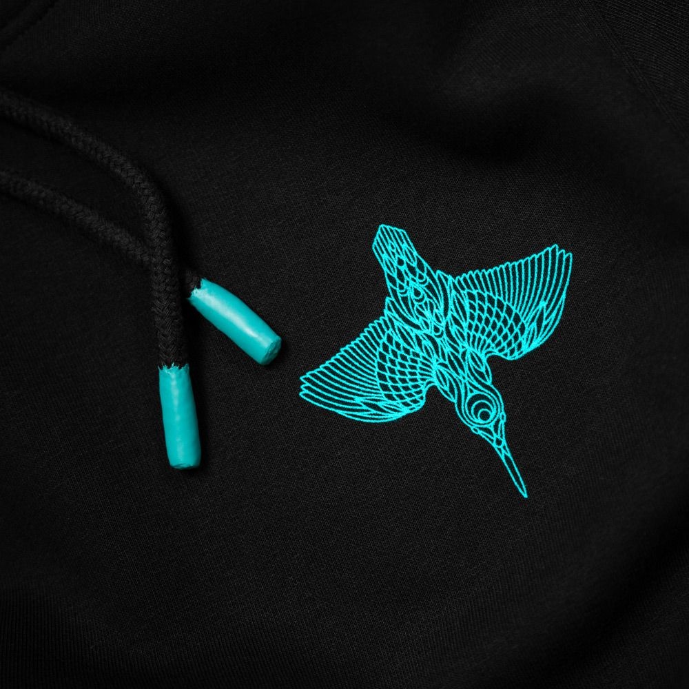 Le Kumu Hoody Take Flight rend hommage au martin-pêcheur emblématique, symbole d'élégance et de rapidité dans la nature. Le design présente une représentation graphique dynamique du martin-pêcheur en mouvement, réalisée dans un style d'illustration en ligne claire. Les tons vibrants bleu électrique et cuivre se détachent avec éclat, créant un effet quasi 3D qui rend ce sweat unique.