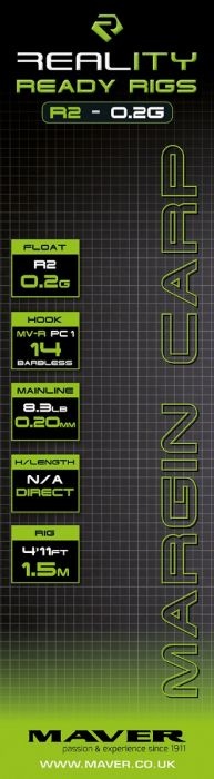 Margin Carp lignes préparées (enrouleur, flotteur, ligne, plomb & hameçon)Les flotteurs sont disponibles en : 0,2g, 0,3g et 0,4gTous les montages sont de 1.50m de longLa ligne principale est de 0.20mmHameçon : taille 14 MV-R
