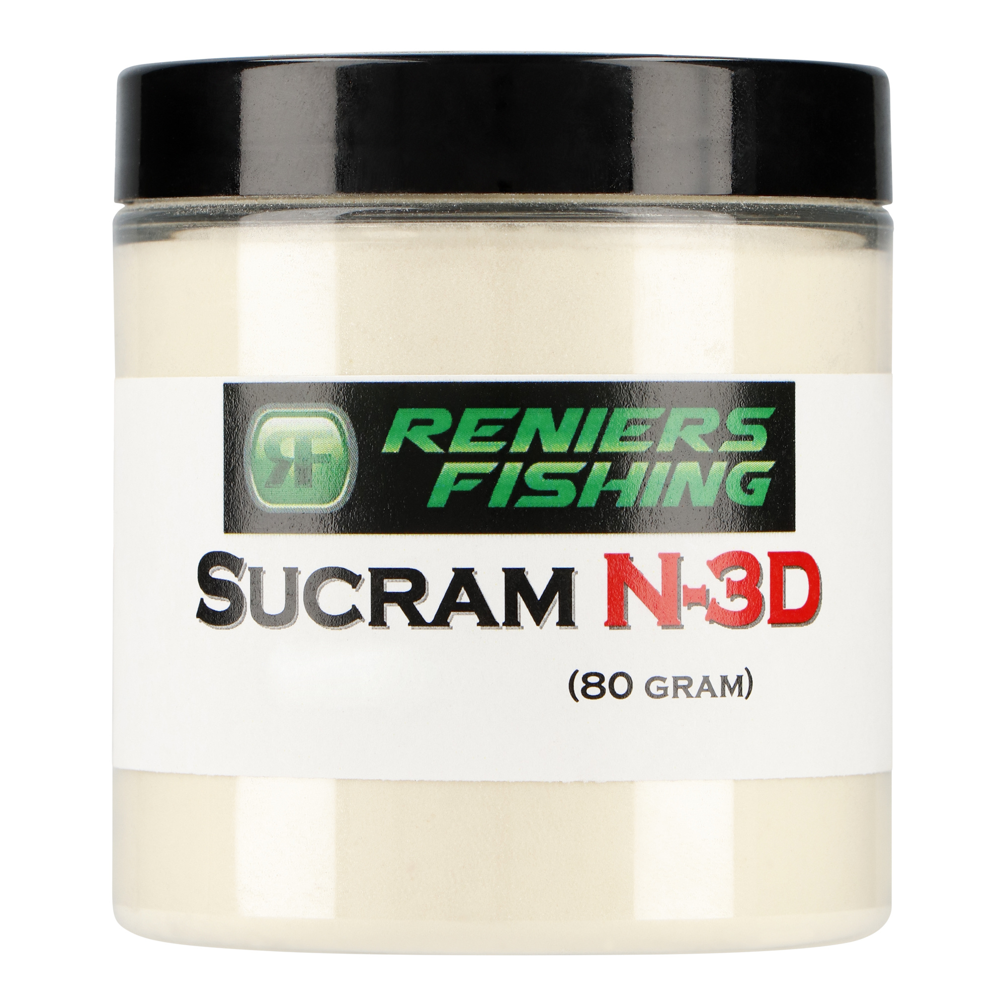 Reniers Fishing Sucram 3D 100g : édulcorant puissant à la vanille, indispensable pour la brème, les canaux et la carpe. Idéal pour particules, bouillettes, asticots et casters.