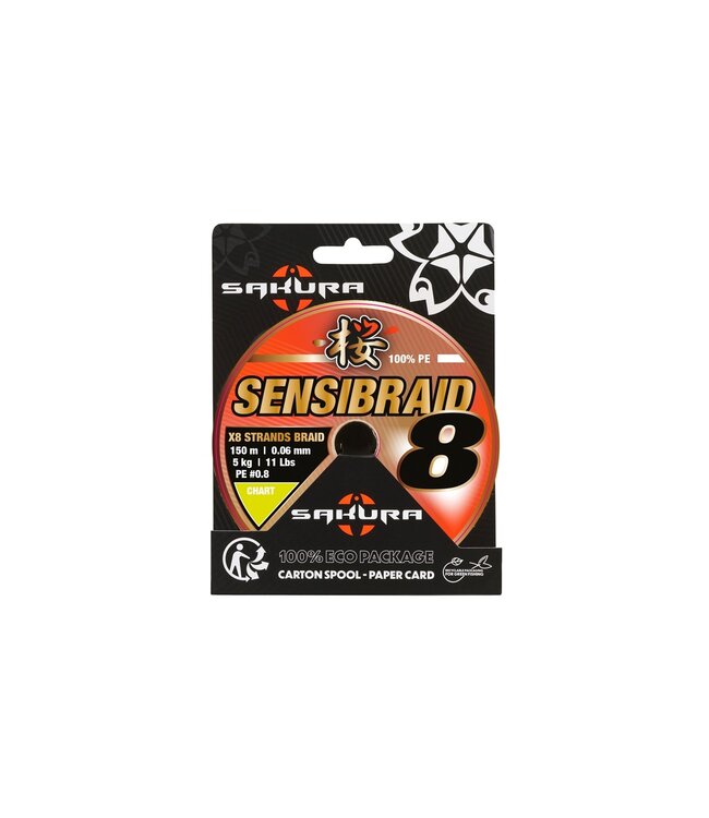 Sakura Sensibraid 8 Chartreuse 150 m est une tresse HMPE 8 brins de haute qualité. Le pas Micro Pitch 32 crée un tressage serré et un profil rond pour un passage silencieux dans les anneaux et une trajectoire stable.