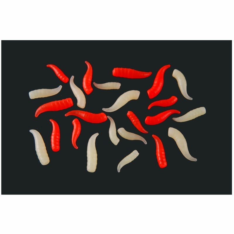 Asticots artificiels, assortis en différentes tailles, formes et couleurs, ils peuvent être utilisés seuls ou en combinaison avec des appâts naturels. Leur légèreté peut être utilisée pour contrebalancer le poids du crochet. Ils peuvent être plongés dans des arômes liquides pour augmenter l'attractivité.
