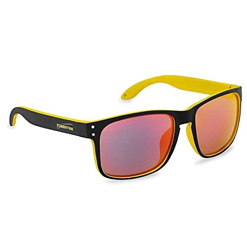 Modèle avec monture carrée bicolore jaune et noire et lentilles polarisantes de grande taille. Très légères, elles sont idéales pour la pêche et le temps libre. Disponible en trois couleurs de lentilles : gris foncé, rouge miroir et rose.