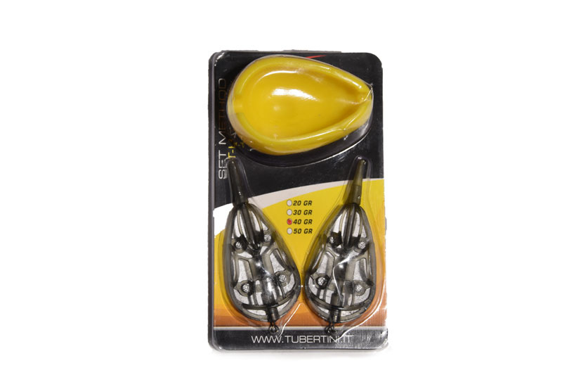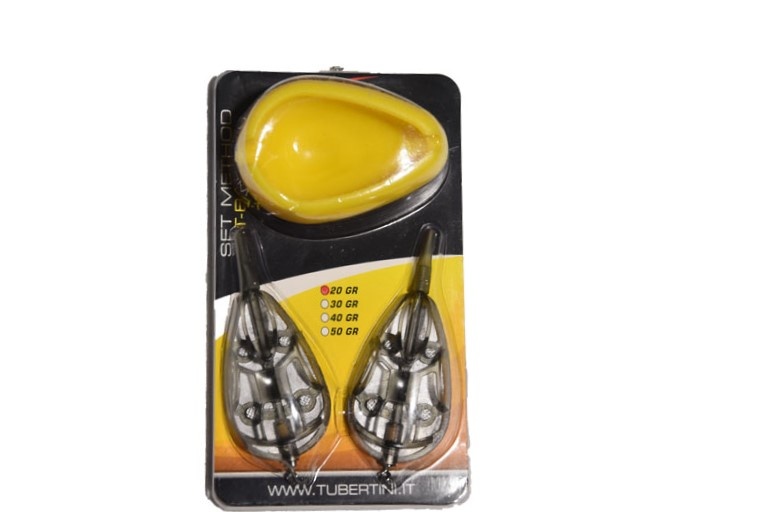 Mangeoire à méthode en ligne avec plomb plat. La forme de poire permet un lancer précis et une chute parfaite dans l'eau. Emballage avec moule en silicone.