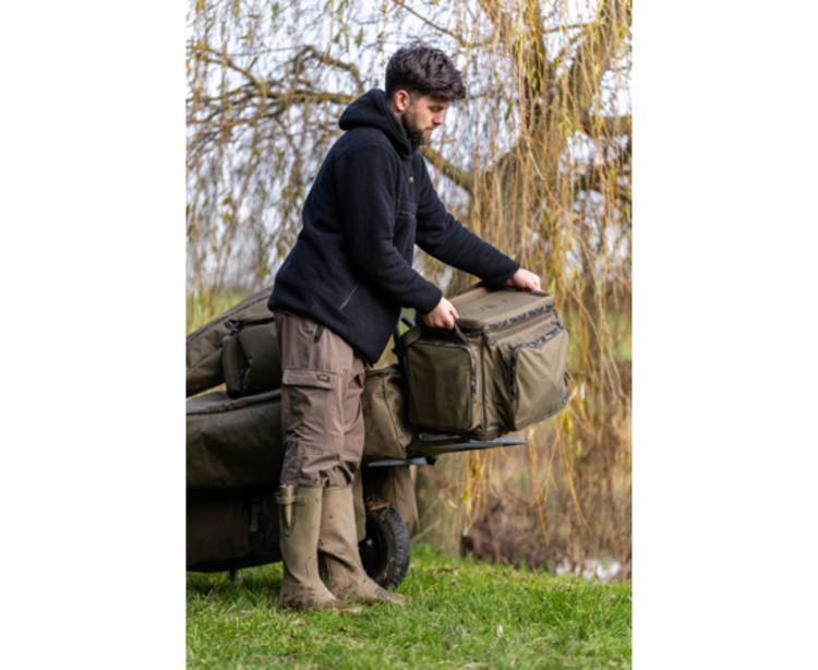 De carryall is vervaardigd uit duurzaam en waterafstotend 600D Oxford polyester, met zware 10 mm ritsen voorzien van Avid Camo-detail. De tas beschikt over drie externe vakken: een groot voorvak en twee zijvakken voor snelle toegang. De afneembare, gevoerde schouderriem en handgrepen aan de zijkant maken transport eenvoudig, ook op een barrow.