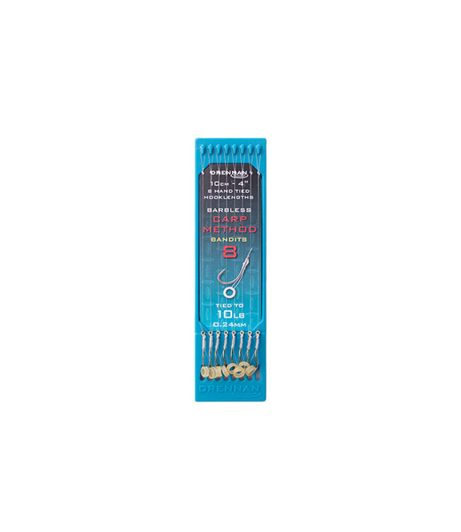 De Drennan Carp Method Bandit 10cm zijn kant-en-klare onderlijnen die speciaal zijn ontworpen voor het vissen met de method feeder. Deze rigs zijn 10 cm lang (4 inch) en worden geleverd op een handige rigplate die de lijnen licht onder spanning houdt. Zo blijven ze perfect recht zonder knikken en zijn ze direct klaar voor gebruik.