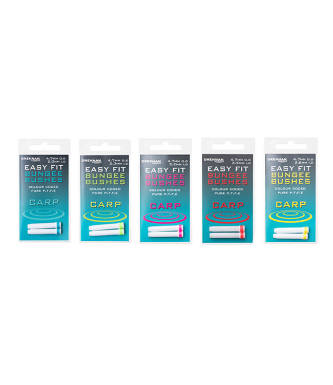Carp Easy Fit Bungee Bushes hebben een standaard O.D. van 4,7 mm met vijf interne diameters. Deze omvatten Aqua (2,0mm), Groen (2,3mm), Geel (2,6mm), Roze (3,2mm) en Rood (3,5mm).