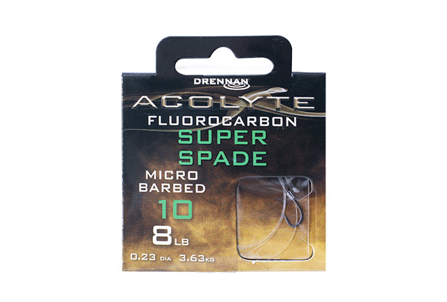 • De Drennan Acolyte Fluorocarbon Super Spade Micro Barbed (50 cm) is dé keuze voor vissers die maximale kracht, duurzaamheid en haakscherpte nodig hebben bij het vissen op grotere vissoorten. De Super Spade is het sterkste haakmodel in de Acolyte-serie en is ontworpen om robuust aas als maïs, worm, vleesblokjes en madenbosjes aan te kunnen.