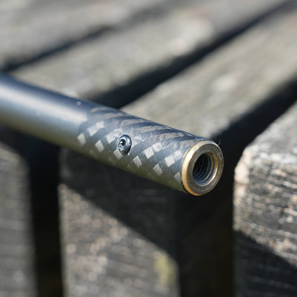 Het bovenste gedeelte is uitgerust met een gelijmde messing schroefdraad, versterkt met een extra carbonmat en vastgezet met een roestvrije klinknagel – dit garandeert maximale betrouwbaarheid. De onderzijde van het eerste deel is ook voorzien van een extra versteviging, wat deze steel geschikt maakt voor intensief en zwaar gebruik, zoals bij het landen van grote karpers.