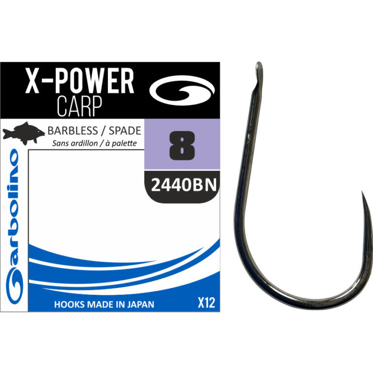 De X-Power Carp 2440BN is de nieuwste toevoeging aan het Garbolino assortiment van haken voor karper en grote vissen. Deze gloednieuwe X-Power Carp heeft een Black Nickel kleur die een sterk gesmeed karakter laat zien. Het heeft een wijde opening en een uitgesproken "hazenbek"-vormige punt die zorgt voor een buitengewone greep, waardoor het risico dat de vangst tijdens het gevecht losschiet, aanzienlijk wordt beperkt. Dit is een weerhaakloze schoephaak. Het is de koningshaak voor het karpervissen en de visserij.