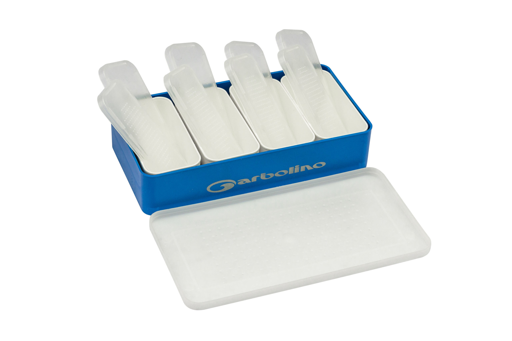 Alle vier de aasdozen worden geleverd in een grote container met een micro-geperforeerd deksel dat zorgt voor luchtcirculatie tijdens transport. De dozen zijn vervaardigd uit sterk en licht kunststof, bestand tegen vocht en gemakkelijk schoon te maken.