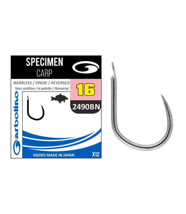 De Garbolino Specimen Carp 2490BN Reversed Barbless - Spade is een hoogwaardige en ultra sterke weerhaakloze haak die speciaal ontworpen is voor het vangen van grote karpers en specimenvis op uitdagende wateren zoals Socourt-parcoursen.