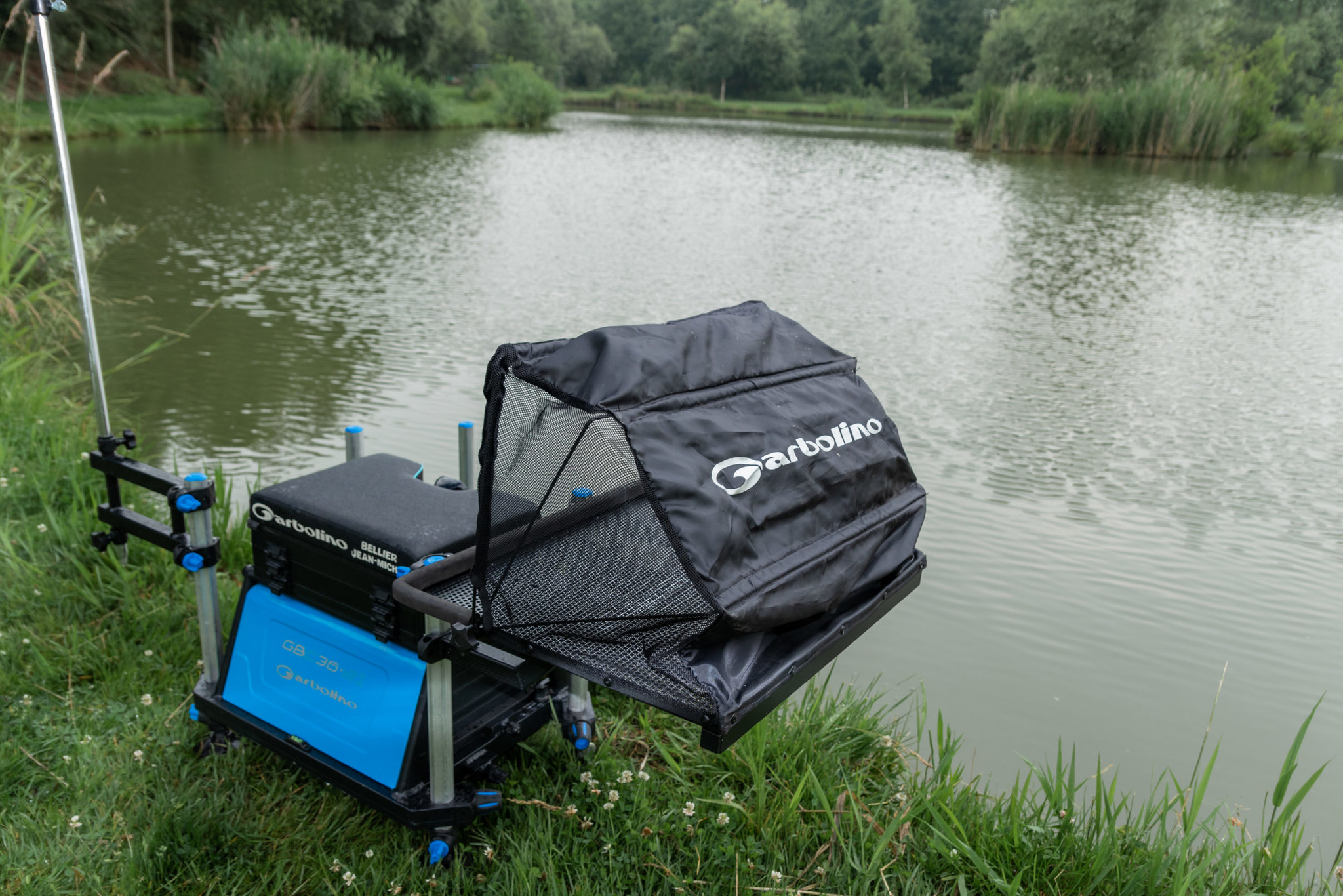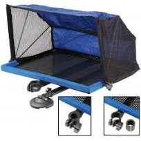 • De ideale aastafel wanneer je wisselende weersomstandigheden kunt verwachten in de loop van je visdag.  Je kunt comfortabel vissen met de kap omlaag en deze omhoog trekken wanneer het begint te regenen; dit helpt om je aas in topconditie te houden gedurende de vissessie.  De kap wordt op haar plek gehouden met twee instelwielen die aan weerszijden van de aastafel te vinden zijn.