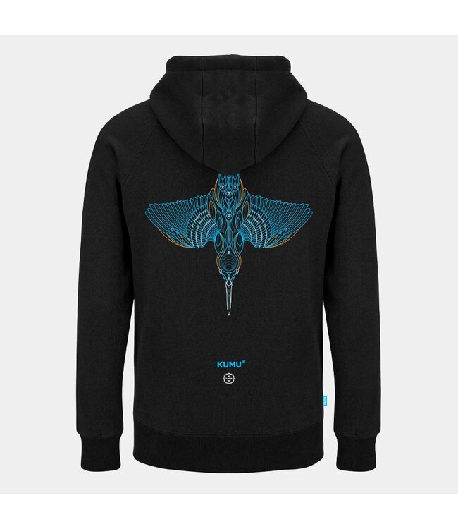 De Kumu Hoody Take Flight is een ode aan de iconische ijsvogel, een symbool van elegantie en snelheid in de natuur. Het ontwerp bevat een dynamische grafische weergave van de ijsvogel in beweging, uitgevoerd in een opvallende keyline-illustratiestijl. De levendige elektrische blauwe en koperkleurige tinten springen echt van het doek en creëren bijna een 3D-effect dat deze hoody uniek maakt.