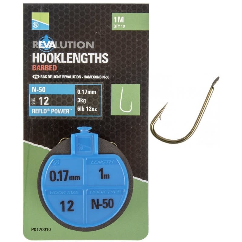 Een range aan topkwaliteit onderlijnen, specifiek ontwikkeld voor het feedervissen. Elke spoel bevat tien 1 meter lange onderlijnen, die simpel afgerond kunnen worden en dan aan je hoofdlijn bevestigd kunnen worden. De volgende onderlijn kan dan op de plek gehouden worden met behulp van de roterende pin op de spoel, hierdoor hoef je geen losse pinnen te gebruiken. Hoge kwaliteit Natural N Series haken zijn geknoopt aan het beproefde en geteste Reflo Power. De onderlijnen kunnen opgeslagen worden in het Revalution Storage System, perfect om al je onderlijnen op orde te houden, weg van het vocht en direct zonlicht.De N-50 is de ideale keuze voor het landen van grote hoeveelheden vis of voor het gericht vissen op hard vechtende vissoorten zoals karper en barbeel. De dikkere haaksteel biedt je alle vertrouwen wanneer je grotere vissoorten weet te haken, perfect voor rivieren en grote natuurlijke wateren.