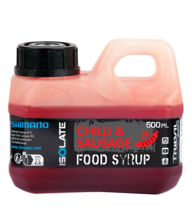 De Shimano Bait Isolate Food Syrup Attractant Chilli Sausage 500ml is een eiwitrijke liquid booster die perfect aansluit bij het voedingsprofiel van de Isolate Chilli & Sausage Boilies. Deze stroperige attractor combineert hydrolysed animal protein met een pittige chilli toets en een uitgesproken sausage flavour. Daardoor ontstaat een krachtige meaty en spicy geurwolk die karper snel naar je voerplek trekt en ze actief aan het azen houdt.