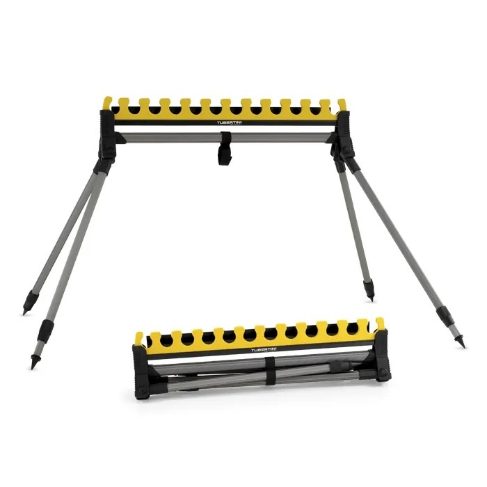 De Kitsteun Easy 4 Legs van Tubertini voorkomt dat uw kits en hengel per ongeluk verschuiven. U kan op deze kitsteun 12 kits op een veilige manier opbergen tijdens uw vissessie. De telescopische poten zijn voorzien van een hefboomvergrendeling.