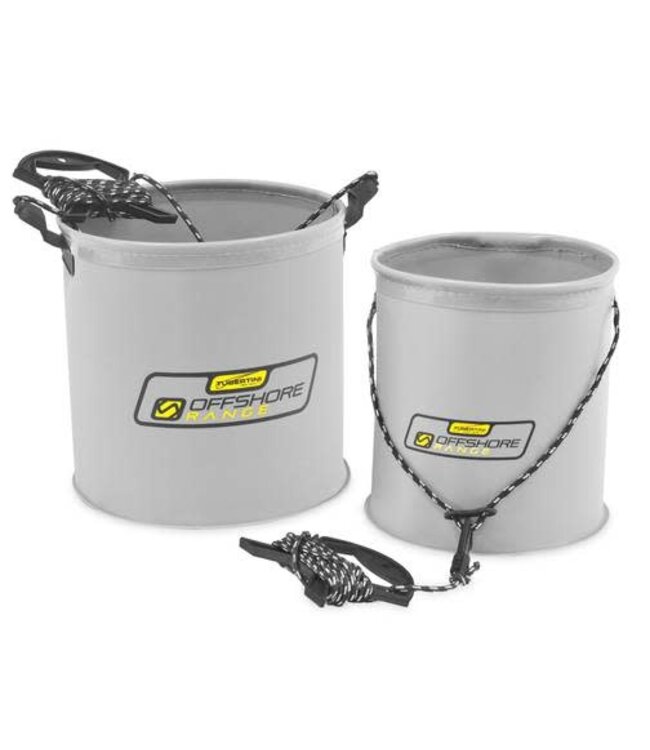 Ronde emmers om water in op te vangen, handig om grondaas nat te maken, handen te wassen, enz. Gemaakt van samendrukbaar plastic na gebruik, ze zijn compleet met koordhaspel en 3 meter lang touw.